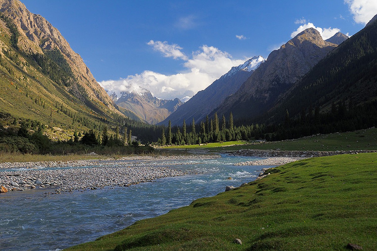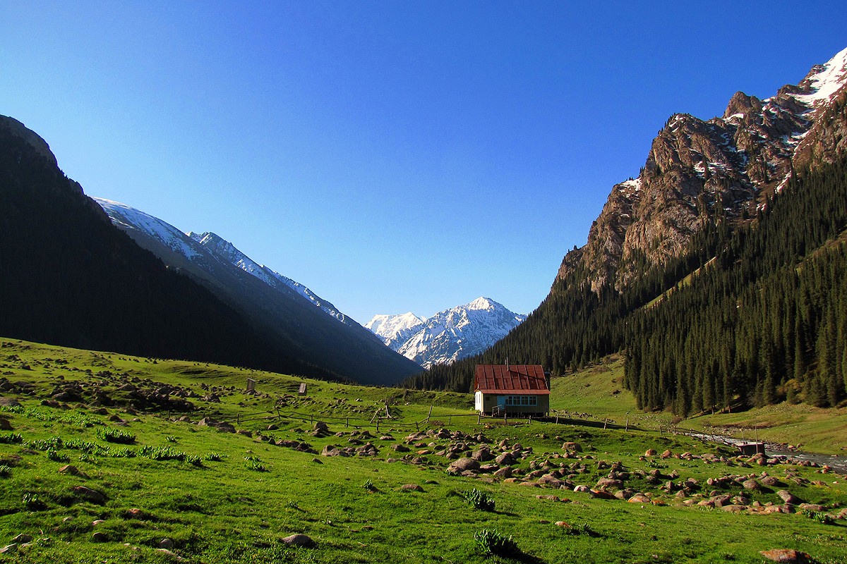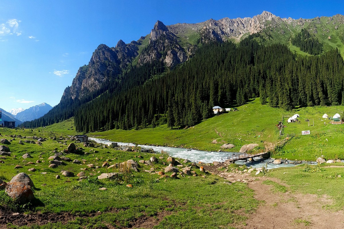 Далее дорога ведёт в долину Чон-Кемин — широкую горную долину с пастбищами, реками и хвойными склонами. Обед и размещение в гостевом доме.